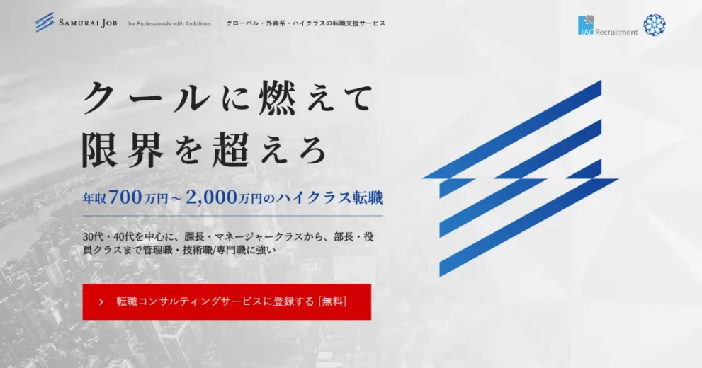 「Samurai Job(サムライジョブ)」は、外資系・グローバル企業へのハイクラス転職に特化した転職支援サービスです。年収800万円以上の求人を中心に、課長・マネージャークラスから部長・役員クラスまでの管理職・専門職に強みを持っています。